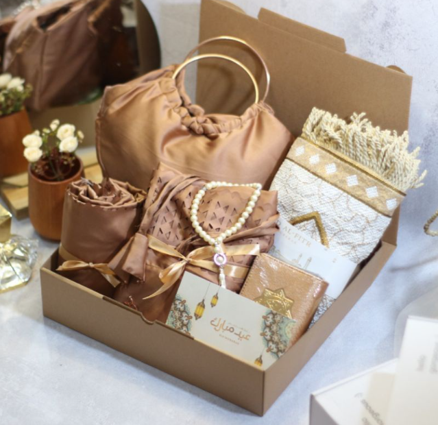 - Isinya: Sajadah travel yang ringan, mukena atau sarung premium, dan tasbih digital.