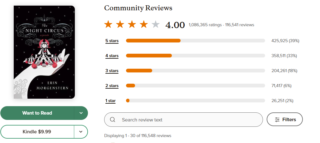 The Night Circus juga telah mendapat  rata-rata rating 4.00 dari 5 bintang, yang berasal dari lebih dari 1.08 juta penilaian pembaca di Goodreads.