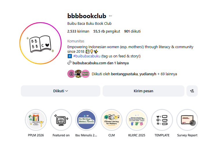 Komunitas literasi yang hadir sebagai wadah bagi perempuan Indonesia untuk bertumbuh dan meningkatkan kualitas diri melalui aktivitas membaca. Dengan basis massa mencapai hampir 10.000 pengikut di Instagram, klub buku ini aktif menggerakkan budaya baca yang inklusif dan kolaboratif.