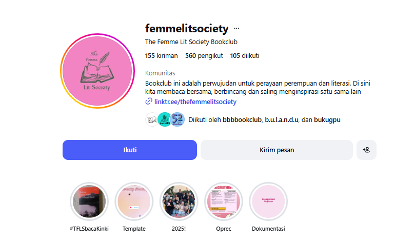 The Femme Lit Society adalah komunitas literasi yang hadir sebagai ruang hangat bagi perempuan untuk membaca, berdiskusi, dan menemukan suara diri. Fokus utamanya adalah mengeksplorasi buku-buku bertema perempuan serta karya inspiratif dari penulis perempuan, meskipun mereka tetap terbuka pada berbagai tema lain untuk memperluas wawasan. Di sini, setiap anggota diajak untuk saling menguatkan melalui pertukaran perspektif dan representasi perempuan dalam literasi.