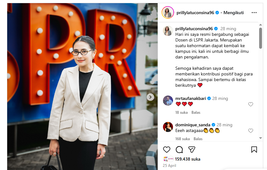 Prilly Latuconsina  tercatat bergabung sebagai dosen di London School Public Relation (LSPR) sejak April 2025. Sebelum resmi menjadi dosen di LSPR, Prilly tercatat aktif dalam program Praktisi Mengajar yang diinisiasi oleh Kementerian Pendidikan, Kebudayaan, Riset, dan Teknologi (Kemendikbudristek). Prilly juga pernah mengajar di Fakultas Ekonomi dan Bisnis Universitas Udayana, Bali. Selain itu, ia juga pernah bergabung dalam program Praktisi Mengajar, di mana ia juga perna mengajar di Departemen Ilmu Komunikasi Universitas Gadjah Mada, khususnya dalam mata kuliah Kajian Selebitas.